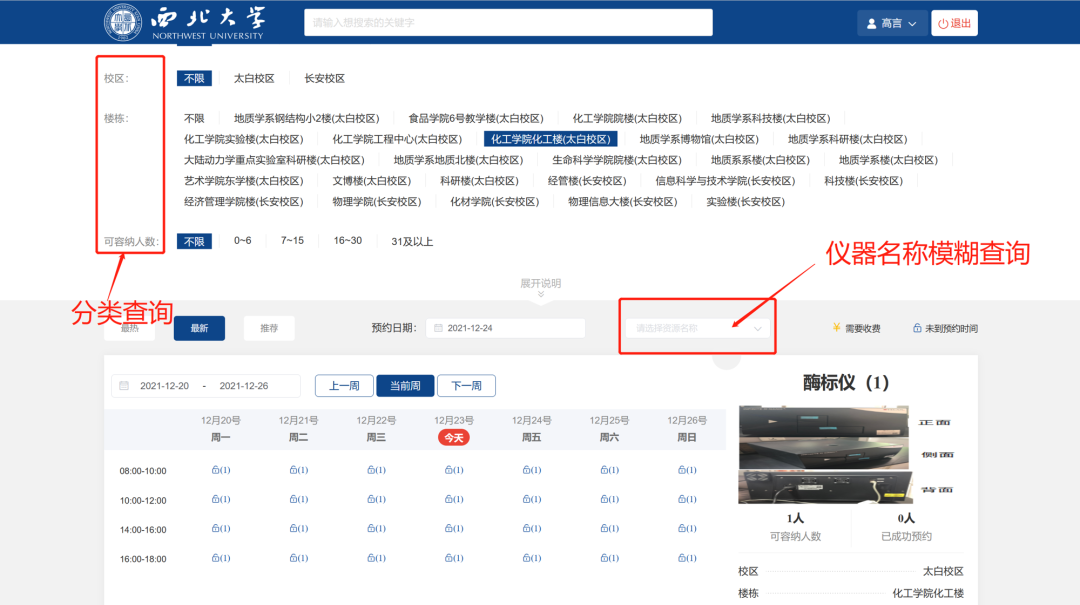 可按照校區(qū)、開放人群、存放地點進(jìn)行分類查詢,或依據(jù)儀器名稱進(jìn)行模糊查詢。
