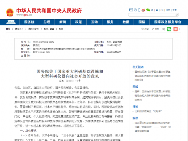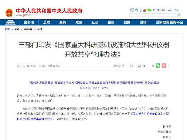 大型儀器開放共享是充分挖掘高校資源潛能的重要舉措。2014年國務(wù)院發(fā)布《關(guān)于國家重大科研基礎(chǔ)設(shè)施和大型科研儀器向社會開放的意見》(國發(fā)〔2014〕70號),2017年科技部、發(fā)展改革委、財政部三部門發(fā)布《國家重大科研基礎(chǔ)設(shè)施和大型科研儀器開放共享管理辦法》(國科發(fā)基〔2017〕289號),要求推進(jìn)國家重大科研基礎(chǔ)設(shè)施和大型科研儀器的開放共享,進(jìn)一步提高資源利用效益。