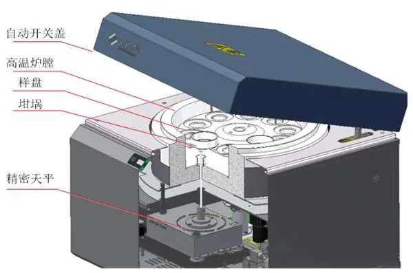 自動(dòng)化的儀器設(shè)備可以很大程度的節(jié)省人力,一次稱重,就能自動(dòng)獲得所有過程重量并自動(dòng)計(jì)算結(jié)果。自動(dòng)化的分析設(shè)備實(shí)際就是將精密天平、高溫設(shè)備集成在一起,如圖2,是某家廠商的自動(dòng)水灰分析設(shè)備,其主體部分包括:自動(dòng)開關(guān)蓋、高溫爐、旋轉(zhuǎn)升降樣盤、天平模塊幾部分,關(guān)鍵技術(shù)涉及高溫爐溫度精準(zhǔn)控制、爐腔內(nèi)溫場(chǎng)均勻穩(wěn)定、天平隔熱等。