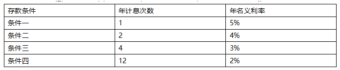 A.方案一B.方案二C.方案三D.方案四參考答案:D2.某企業(yè)面對金融機構提供的四種存款條件,相關數(shù)據(jù)如下表,最有利的選擇是()。