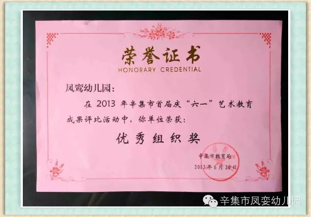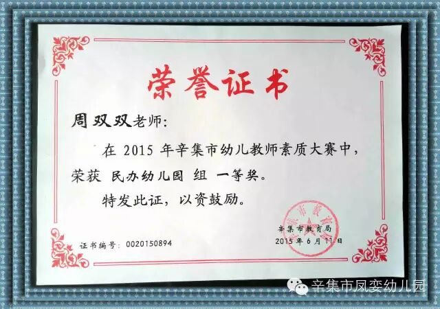 辛集市教育局首屆慶六一藝術(shù)教育成果比賽中,我園獲優(yōu)秀組織獎,四位老師指導(dǎo)的舞蹈分別獲一等獎、二等獎。2015年5月我園教師周雙雙參加辛集市幼兒教師素質(zhì)大賽獲一等獎。