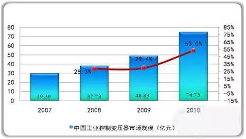 工業(yè)控制行業(yè)的穩(wěn)定增長帶動工業(yè)控制用變壓器行業(yè)市場規(guī)模的穩(wěn)定的增長,工業(yè)控制用變壓器市場規(guī)模從2007年的29.39億元增長至2010年的74.73億元。