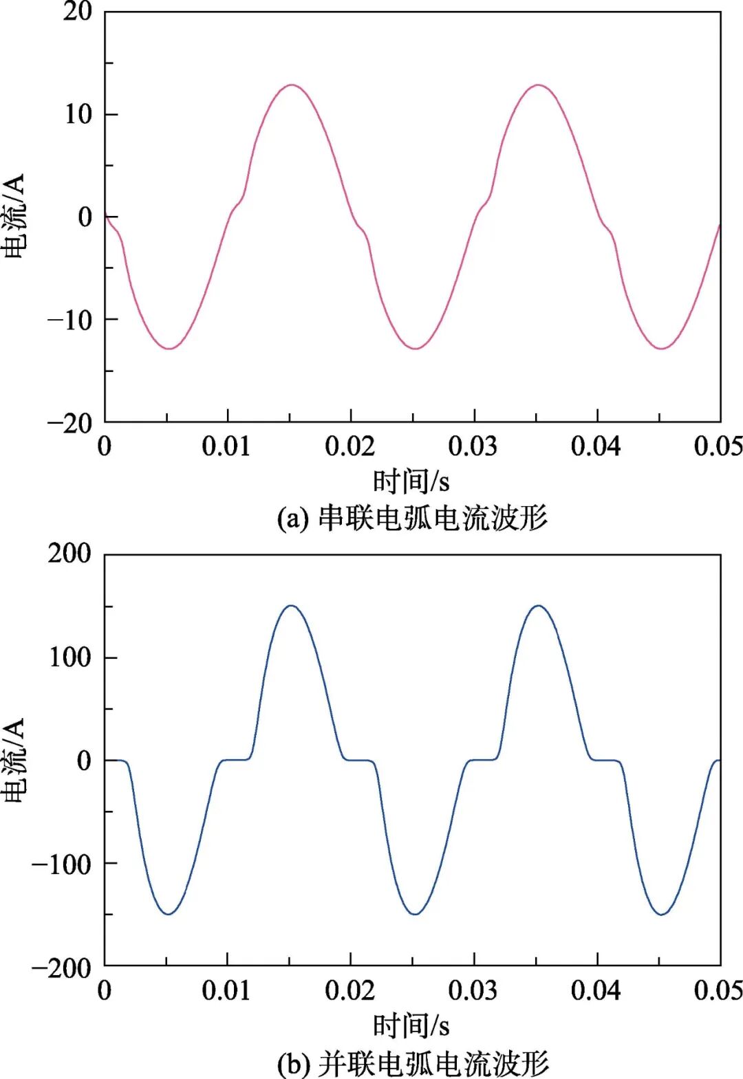 為驗證實驗室用電系統(tǒng)仿真模型的準確性,通過PSCAD軟件仿真得到串并聯(lián)電弧電流仿真波形,如圖4所示,當(dāng)發(fā)生兩種不同類型電弧故障時,電弧線路電流均相比標(biāo)準正弦波畸變較大,而且電流在過零點附近變化十分緩慢且接近零值,發(fā)生零休現(xiàn)象,與實際低壓電弧電流波形相符。為對比并聯(lián)與串聯(lián)電弧故障,經(jīng)過多次仿真實驗,觀察到并聯(lián)電弧電流幅值可達到75~500 A??赏ㄟ^對實驗室中的熔斷器或斷路器進行配置以切斷線路,不需要利用時頻信息融合的識別方法。但對于串聯(lián)電弧電流(圖4(a)),其幅值與正常情況相差不大,甚至?xí)螂娀‰娮瓒档停?/span>要采用識別方法判斷。