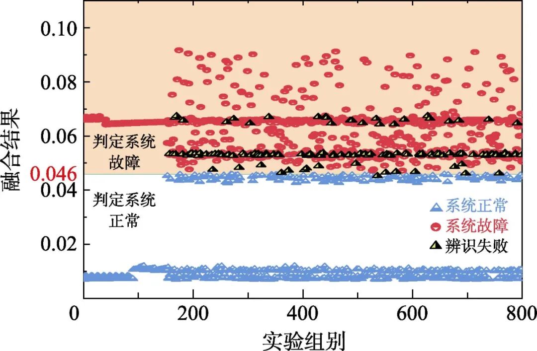 確定時頻信息順序與閾值后,對仿真得到的系統(tǒng)電流的時頻信息進行融合,得到系統(tǒng)電流辨識結(jié)果如圖9所示,當(dāng)系統(tǒng)電流融合結(jié)果低于閾值,判定實驗室內(nèi)電器正常運行;當(dāng)系統(tǒng)電流融合結(jié)果高于0.046時,檢測到系統(tǒng)發(fā)生異常,認定實驗室內(nèi)發(fā)生串聯(lián)電弧故障,最終辨識成功率為90.56%。依據(jù)辨識結(jié)果,實驗室正常用電時,負載中非線性電流占比極大以及大功率電器功率較大的情況可能發(fā)生誤判。但針對高校實驗室可能出現(xiàn)的絕大部分用電情況,該方案均能夠準確辨識。