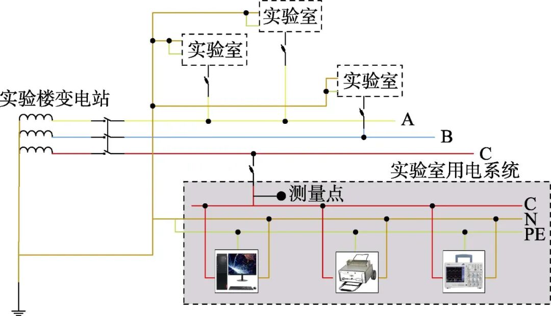 本實驗搭建的實驗室用電系統(tǒng)如圖2所示,用電系統(tǒng)采用三相五線制配電方式并通過低壓電纜線路將電能輸送到各實驗室。三相五線制中五線分別為A、B、C、N、PE線,其中A、B、C線為三相配電線路,N線為工作零線且有電流通過,PE線為保護地線且一般不帶電,用于連接電器設(shè)備外殼防止出現(xiàn)漏電等電氣事故[12]。PE線與N線在變壓器低壓側(cè)連接到一起,入戶后與零線分開使用。實驗室主要有線性負載與非線性負載兩種負載類型,實驗室中使用的電烙鐵、電動機等實驗設(shè)備屬于線性負載,照明電器、計算機等電器設(shè)備屬于非線性負載。