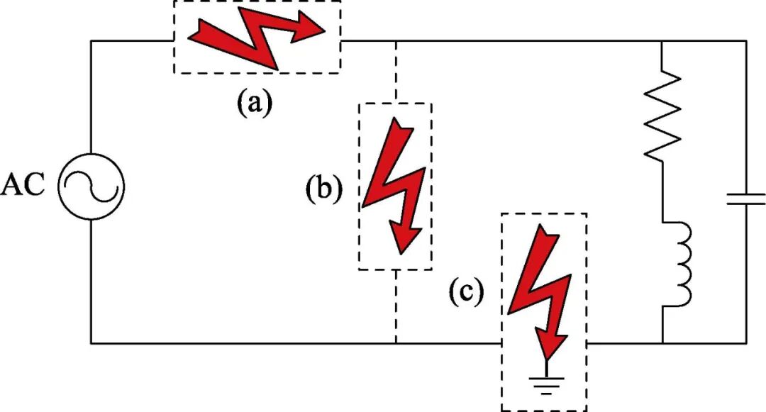 一般將低壓電弧分為串聯(lián)電弧、并聯(lián)電弧和接地電弧。圖1(a)處為串聯(lián)電弧故障,通常是線路連接不良或線路老化等原因造成,流經(jīng)線路的電弧電流小于正常情況下的負載電流。圖1(b)處為并聯(lián)故障電弧,發(fā)生在相線之間或相線與中性線之間,在實驗室中,一般發(fā)生在零線火線之間。由于與負載呈并聯(lián)關(guān)系,其電流相對串聯(lián)電弧電流大得多。圖1(c)處為接地故障電弧,一般發(fā)生在距大地較近的線上,是并聯(lián)電弧故障的一種特殊情況。