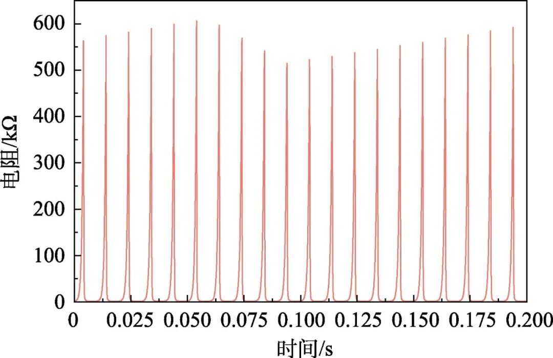 電弧因受到氣壓、流經(jīng)導(dǎo)線磁場的影響,其電流具有一定的隨機性而失去了原有的周期性。電弧模型通過改變電弧電阻體現(xiàn)這一隨機性,仿真得到的電弧電阻波形(圖5)。觀察到電弧電阻的變化具有周期性,但各周期內(nèi)電阻幅值及變化速率均不相同,從而各周期內(nèi)電弧電流也呈現(xiàn)出隨機性。