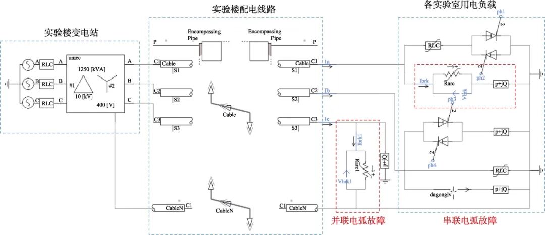 PSCAD/EMTDC軟件能通過Fortran語言編譯器對搭建的仿真模型進行編譯,廣泛應(yīng)用在電力系統(tǒng)仿真當(dāng)中,是目前電力系統(tǒng)領(lǐng)域公認的電磁暫態(tài)仿真軟件,并為用戶提供了訪問和使用MATLAB命令和工具箱的接口。利用PSCAD/EMTDC軟件搭建實驗室用電系統(tǒng)模型如圖3所示,10kV三相電經(jīng)過實驗樓變電站降壓至400V,采用三相五線制方式輸送到各實驗室。在輸電線路上搭建Cassie與Schavemaker電弧模型模擬并、串聯(lián)電弧故障。該模型為非線性電阻元件,通過測量線路電流、電壓,依據(jù)公式(1)和(2)計算得到電弧電阻。